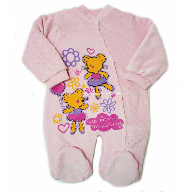 Комбинезон без капюшона, с закрытыми ножками, рукава на манжете, спереди на кнопочках от воротничка до конца ножки. Украшен спереди рисунком персонажей из мультиков.