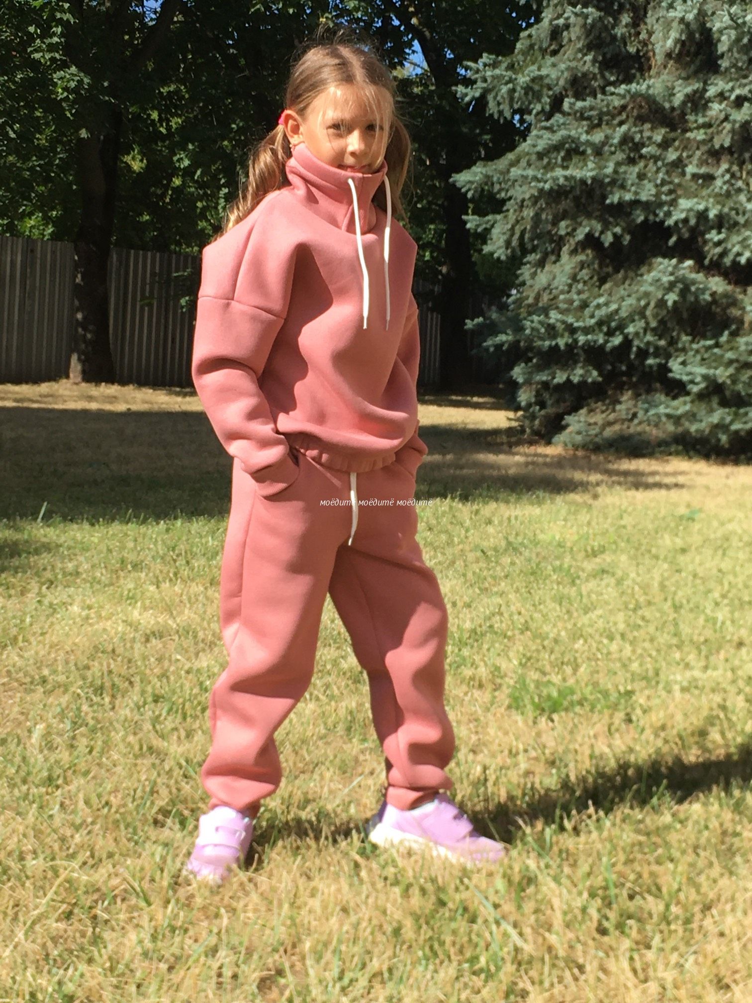 Костюм выполнен из футера 3-хнитки с начёсом. Состоит из свитшота и брюк. Брюки сверху на широкой резинке и со шнурком, снизу на манжете с отворотом. Свитшот с воротником-стойкой, украшен шнурком, снизу вставлена резинка, рукава на манжетах с отворотом.